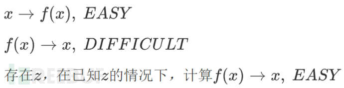 值得一提的是,DH 二位虽然提出了非对称加密体系,但并没有给出一个实例,因为找到一个单项陷门函数并非易事。读者可能会好奇什么是单项陷门函数?单项陷门函数是非对称加密体系的基础,单项函数好理解,即从一方向计算容易,从另一方向反推很困难的函数,如 Hash 函数。陷门函数是一种在一个方向上很容易计算,但在没有特殊信息的情况下很难在相反方向上计算(寻找它的逆)的函数,称为“陷门”。陷门函数是单向函数的一种特殊情况。单向陷门函数的特点概况如下: